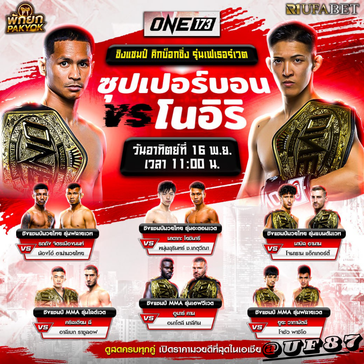 เว็บ แทงมวย ที่เปิดให้แทงมวยวัน One Championship แบบสดๆ ครบทุกคู่ แทงได้ทุกคู่ ราคาเริ่มต้นที่ 10 บาทต่อคู่ ไม่ว่าคุณจะเป็นแฟนมวย แทงยกต่อยก เสมอ ไล่ลง ไม่คิดเงิน สเต็ปมวยไม่ตาย สเต็ปมวย ผสมกันได้ 1 -10 คู่ แอดมินบริการ ตลอด 24 ชม